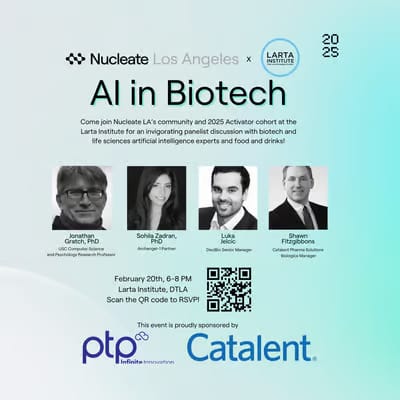 Nucleate is a student-led organization that represents the largest community of bio-innovators. Come join Nucleate LA’s community and 2025 Activator cohort at the Larta Institute for an invigorating panelist discussion with biotech and life sciences artificial intelligence experts and food and drinks.