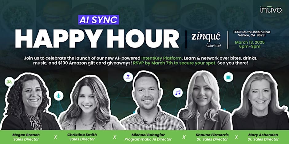 Come join us for a fun and casual AI Sync Happy Hour hosted by Inuvo for digital advertising and marketing specialists! Let's toast to all things adtech, media, and artificial intelligence to celebrate the launch of our new AI-powered IntentKey Platform. Learn & network over bites, drinks, music, and $100 Amazon gift card giveaways!