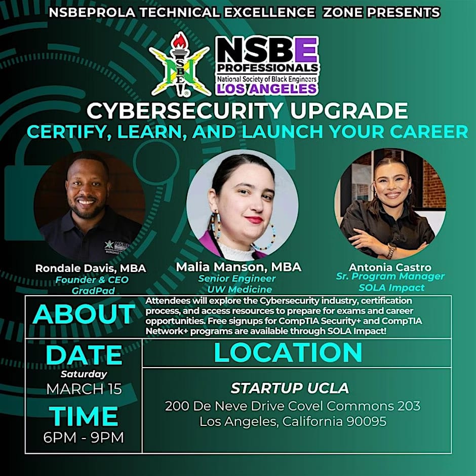 Attendees will explore the Cybersecurity industry, certification process, and access resources to prepare for exams and career opportunities. Free signups for CompTIA Security+ and CompTIA Network+ programs are available through SOLA Impact!